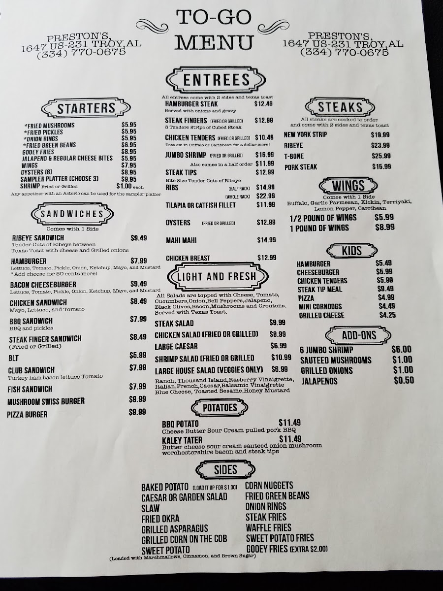 Welcome to Preston's Steak & Grill, a culinary gem nestled in Luverne, Alabama. This charming restaurant delights guests with its impressive selection of expertly cooked steaks, including the tender Filet Mignon and robust New York Strip. Patrons rave about the perfectly seasoned meat and the warm, inviting atmosphere that feels like home.
